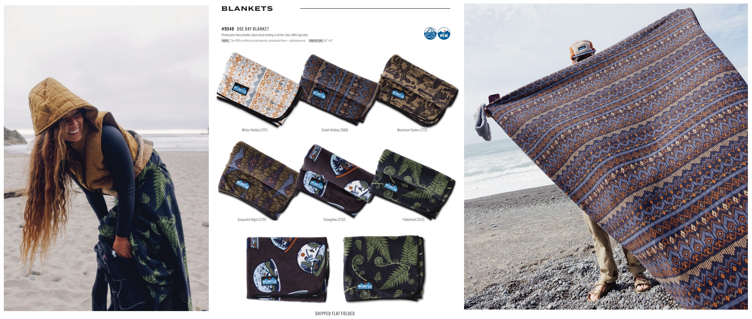 Printed polar fleece blanket, black elastic binding on all four sides, KAVU logo label.