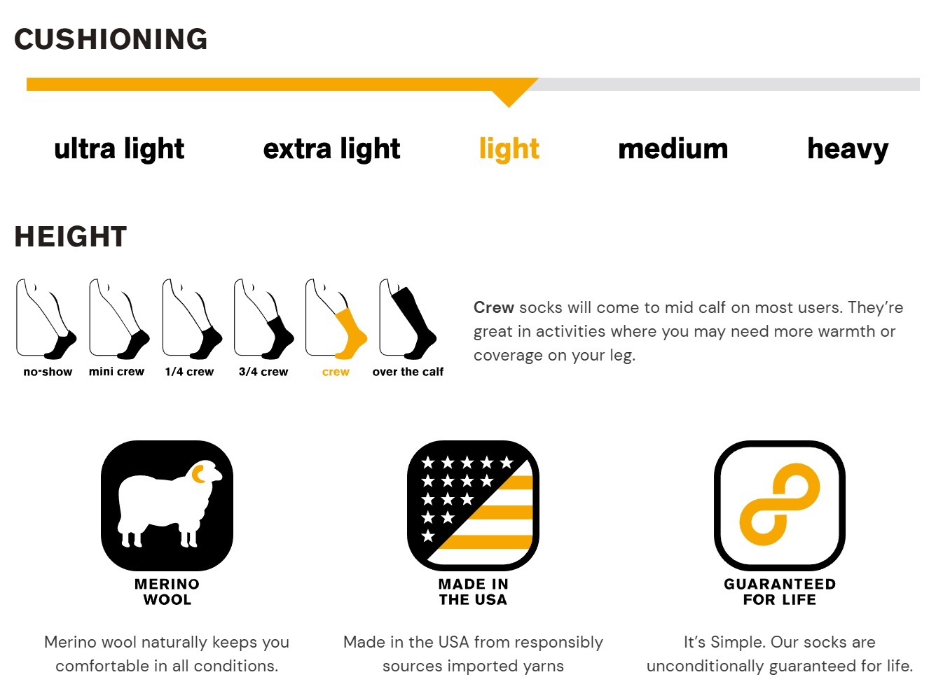 For those seeking light cushioning under the foot and lightweight breathability, the Southwest Light Crew is, dare we say, the perfect fit. With the natural quick dry properties of merino wool, this sock is ideal for long days on the trail or at the office.