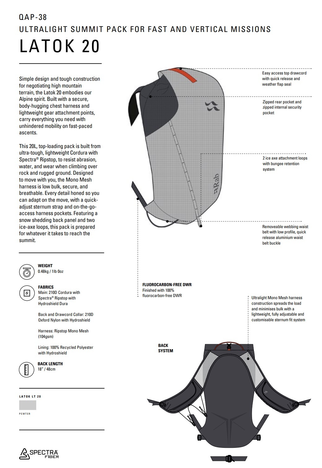 Every detail of the ultralight Latok 20 pack has been refined to keep weight and bulk to a minimum and give you unrestricted mobility on vertical adventures.